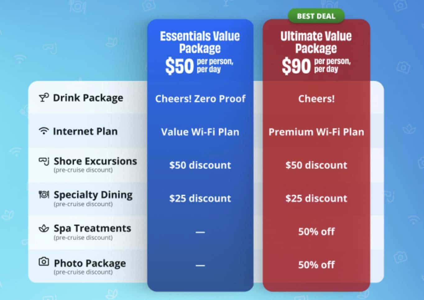 The Essentials Value Package is designed for guests who want a drink package and Wi-Fi but not necessarily the top levels of either.