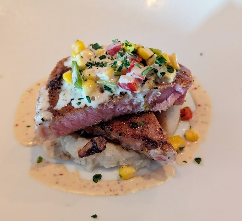 But then the waiter said tonight’s special, which wasn’t on the menu, was an ahi special. I love ahi, but again, it’s not something I’d ever order at home. I asked the waiter which he’d recommend, and he just said, “I’ll bring them both to you.” Full disclosure: I knew he’d just say to get both dishes, but I didn’t want to sound greedy by ordering two entrees unprompted. Both dishes were really tasty and very well done.