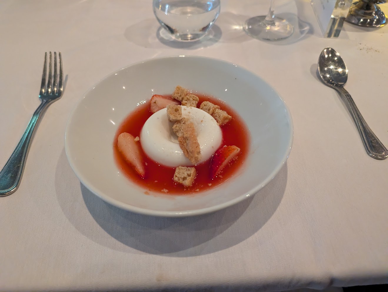 For dessert, I saw chilled strawberry soup and was intrigued. One of my favorite dishes since my first cruise on Carnival was their Strawberry Bisque, served as an appetizer. It was like strawberry ice cream in a bowl (see the recipe here).