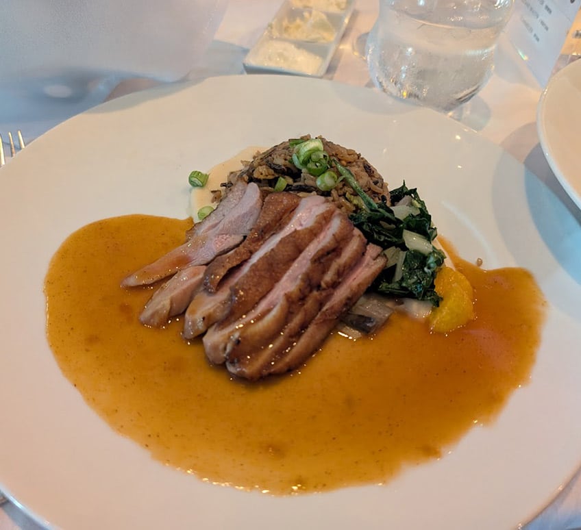 For dinner, I started with the French onion soup again. Celebrity really does this so well, and it’s been my favorite at sea. For the main entrée, I originally planned to go with the seared duck, which I tried on the Apex last year (read that cruise blog here). I loved the fried wild rice that came with it, and the orange duck jus added just enough citrus to brighten up the dish. I also never order duck at home, so it’s a cruise treat for me.