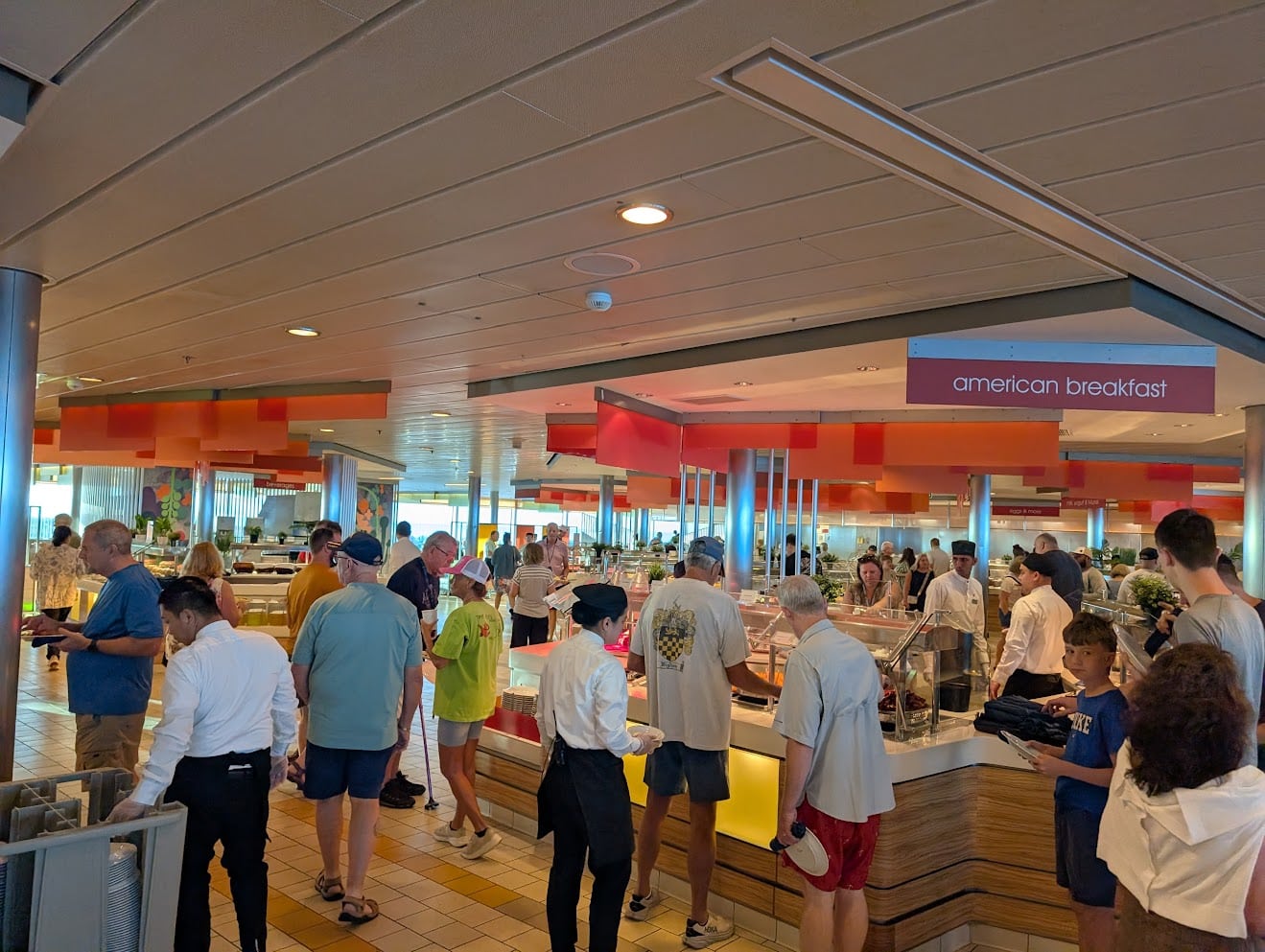 The buffet was busy, but not overly crowded. The biggest issue was that, because it was just the first breakfast, people were standing around not knowing where to go. It could be a bit overwhelming, and while the island design of the food stations reduced lines, it also meant your food might be spread out throughout the area.
