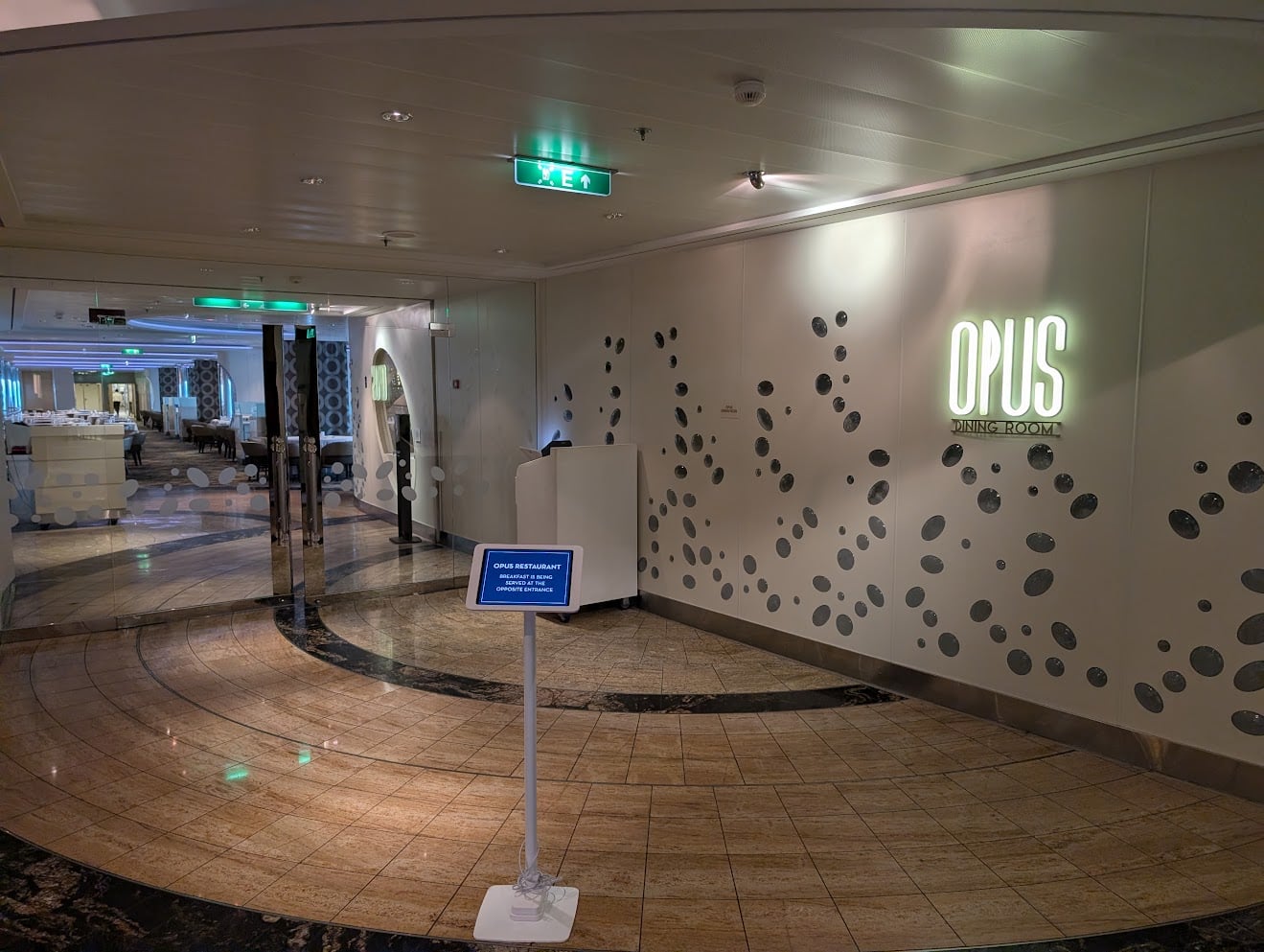 We returned to the Opus Restaurant for our 6 PM reservation. We had Anytime Dining, but scheduled dinner for the same time each night. We walked right up to the podium and were immediately brought back to our same table with our same waiter team. They came and greeted us, and the sommelier asked whether we wanted the same drinks as last night or something different.