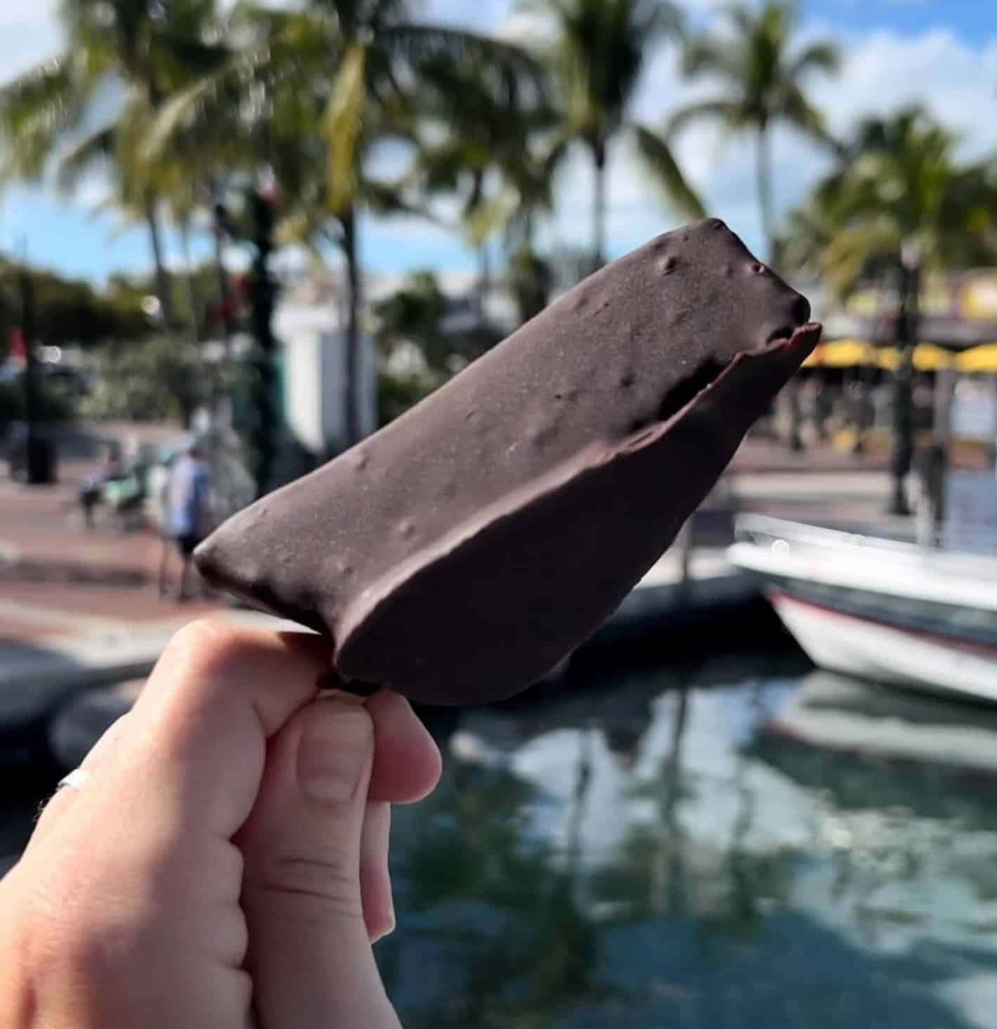 But in this case, convenience won. We saw Kermit’s Key Lime Pie Shop, which had a few locations on Duval Street. I went in and ordered one slice of original Key lime pie and a frozen, chocolate-covered strawberry Key lime pie on a stick.
