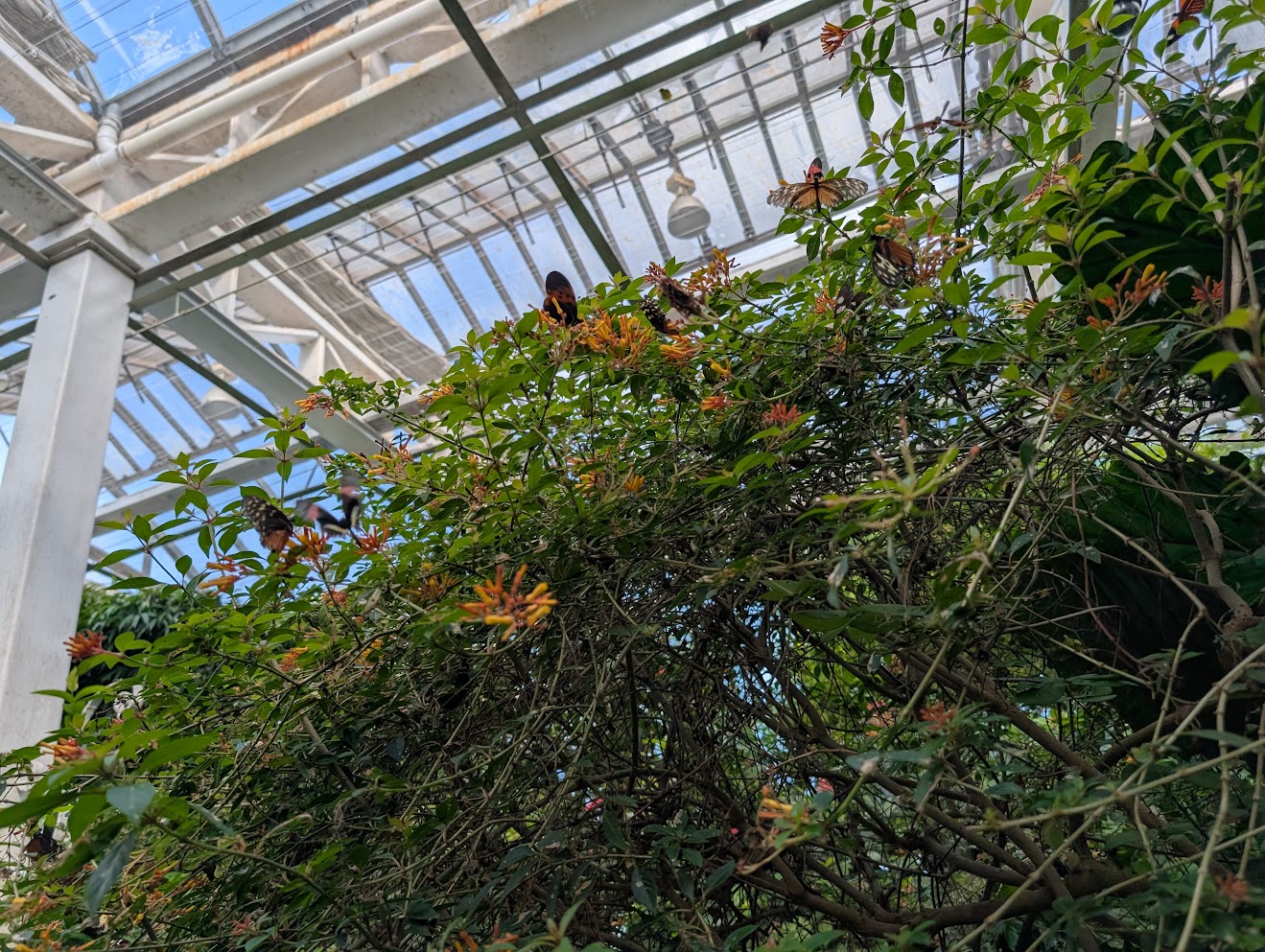 As you walk out, you immediately notice the towering greenery and lush plant life. Looking around, you could see butterflies everywhere. Some are on trees or on stands with fruit to eat, but many are also flying through the air. Signs throughout the area provide information on the types of butterflies and plants in the exhibit.