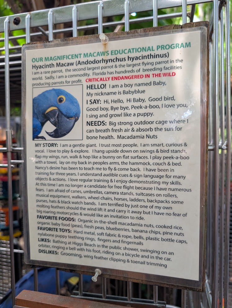 In the back, you could see a lot of the rescued parrots in their cages. Each one had a story of where they came from and why. Many parrot species live 30 to 80 years, so they can outlive their owners.