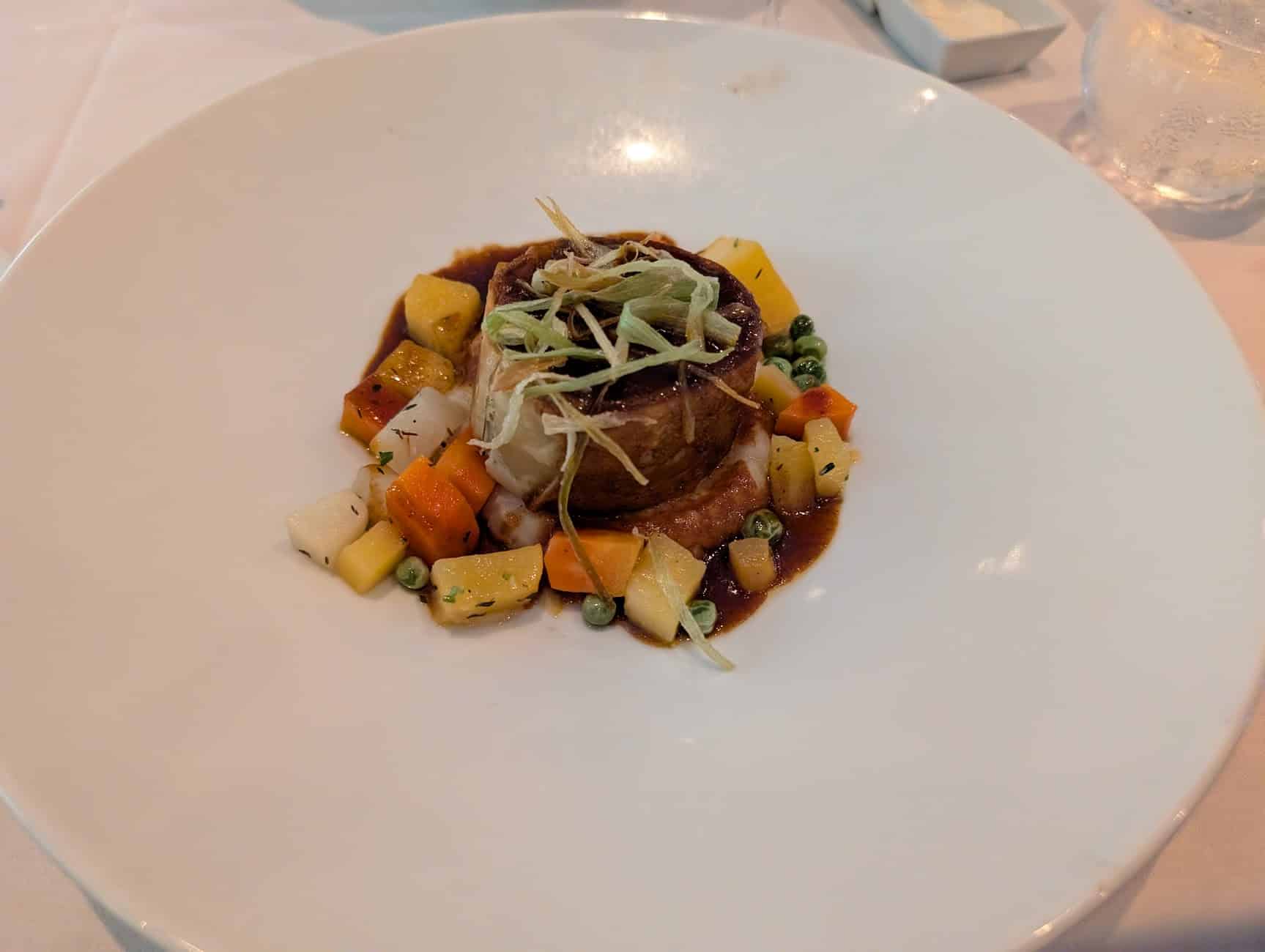 For my main entree, I got the slow-braised lamb wrapped in phyllo. The presentation was very elevated, and although it was probably on the small side, after eating way too much on CocoCay, it was the perfect size for me.