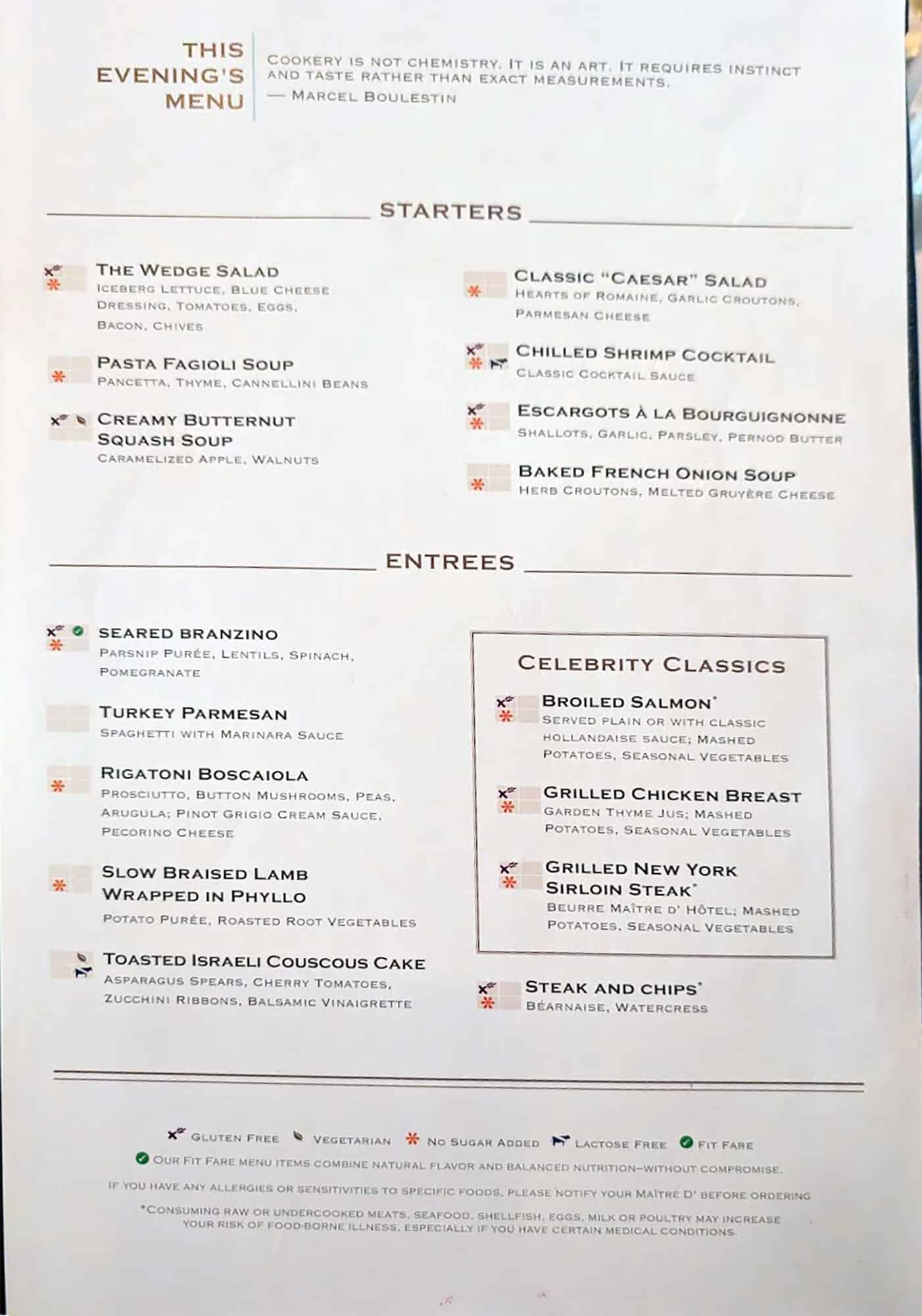 Again, we returned to the Opus Dining Room for our 6 PM dinner reservation. Even though we had anytime dining, we were seated at the exact same table and with the same great dining room team again. Upon arriving at the table, our waiter greeted us with, “Did you have a Perfect Day at CocoCay?” At least four other staff members told us that to us that evening. Either it’s a tired joke they like to use, or Celebrity is pushing their staff to say it to reinforce the idea that it was a “great” day in your mind.