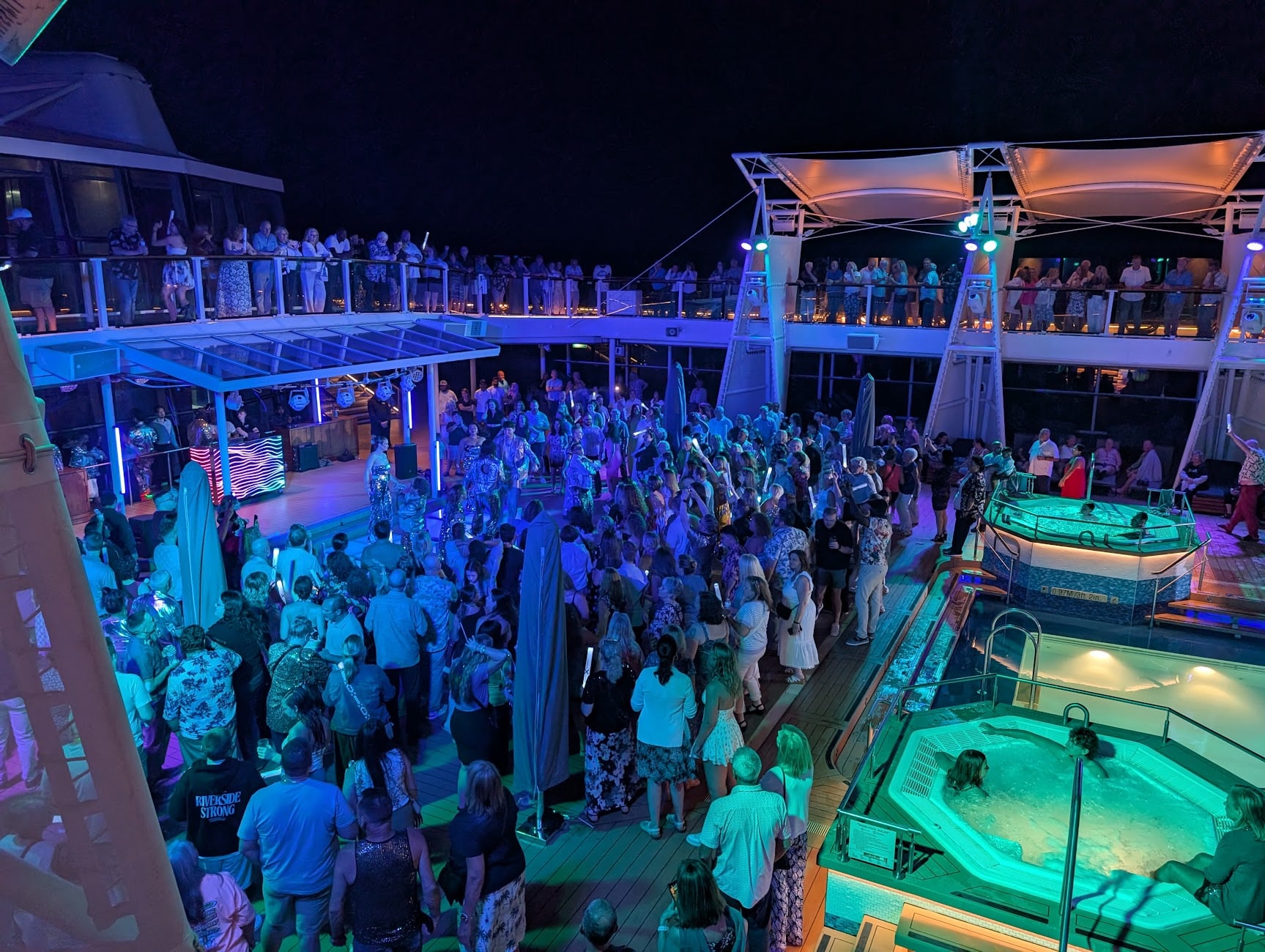 This evening was Celebrity’s “Shine the Night” theme party, which started at 10 PM on the pool deck. It’s an event where Celebrity encourages you to “wear your shiniest metallic outfit and join us for an unforgettable evening of fun, vibrant energy, surprise performances, and a celebration of all that shimmers.”