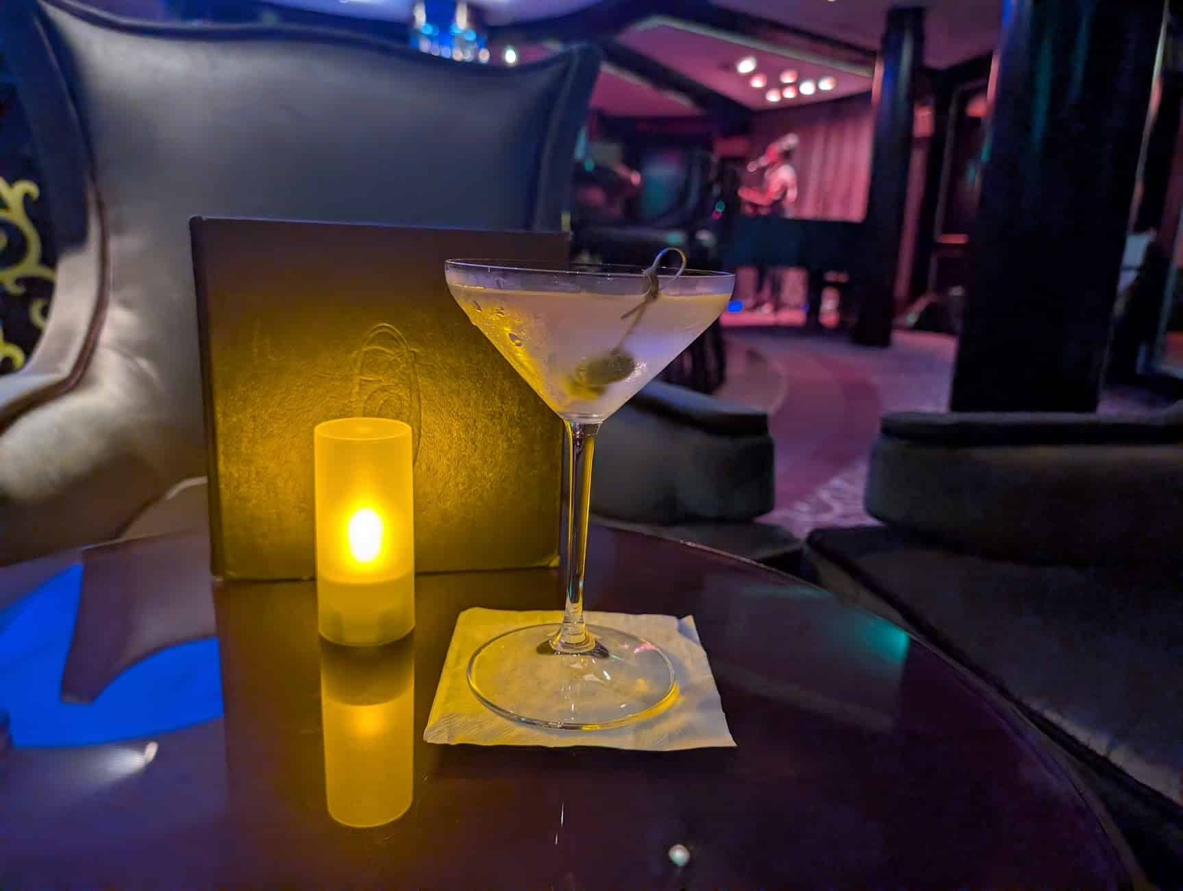 Within a minute, a waiter came over, and I ordered the Dirty Martini. It’s not something I’d ever order if I were paying, but since I had the premium drink package, I figured I’d give it a shot. Since my Mediterranean cruise a couple of years ago (see that blog here), I’ve found myself enjoying green olives more, so I thought this would be a good test. While I doubt a Dirty Martini will ever be my go-to drink, it was quite nice. I enjoyed the salty, briny flavor.