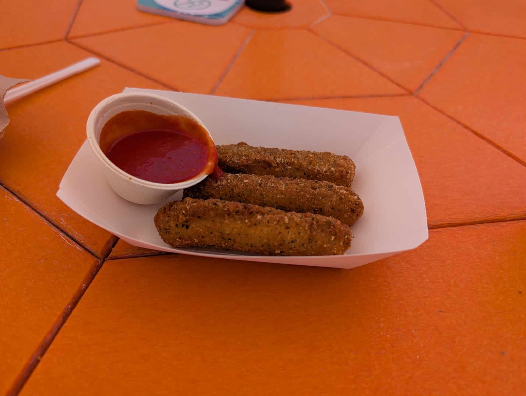 I walked up to the Snack Shack, and there was no line at all. I started off with the mozzarella sticks, which I loved last time. They held up again this time, crunchy on the outside, gooey on the inside, and nice and thick. I don’t know how they also keep them hot and ready. Mozzarella sticks have a notoriously short shelf life after being fried. I also ordered the ceviche, which comes in a small plastic cup with plantain chips. While the presentation in a plastic cup was a bit underwhelming, the ceviche was nice and refreshing with a good bit of acid.