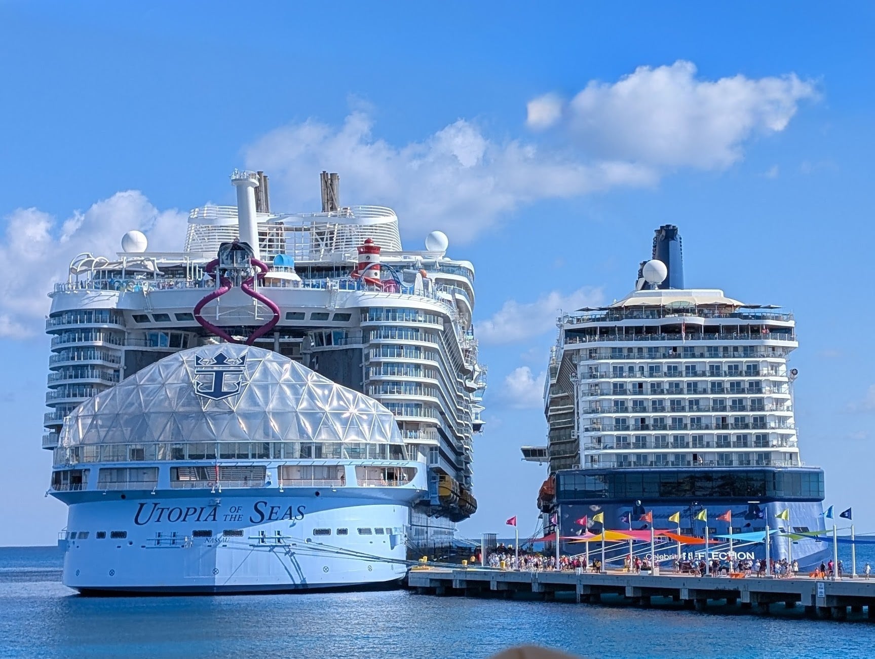 Walking between the two ships, you really get a good sense of how massive these ships are. Standing on the pier, the Reflection towers 13 stories over you while the Utopia of the Seas adds three more stories. It’s not until you walk away from the ships that you see the big difference. Utopia is so much wider than the Reflection. It has a split superstructure design with interior neighborhoods lined with interior cabins, accommodating so many more guests.