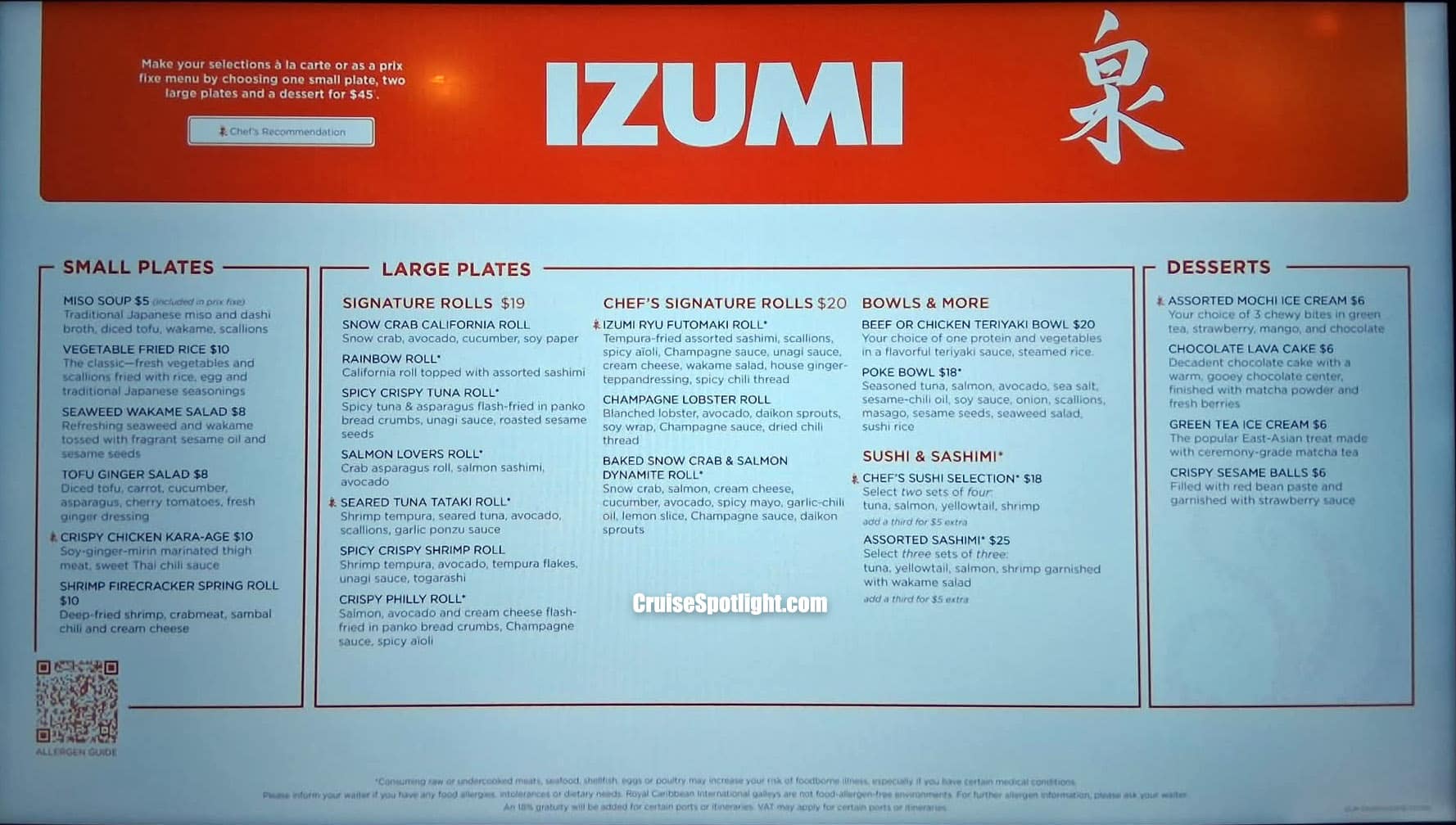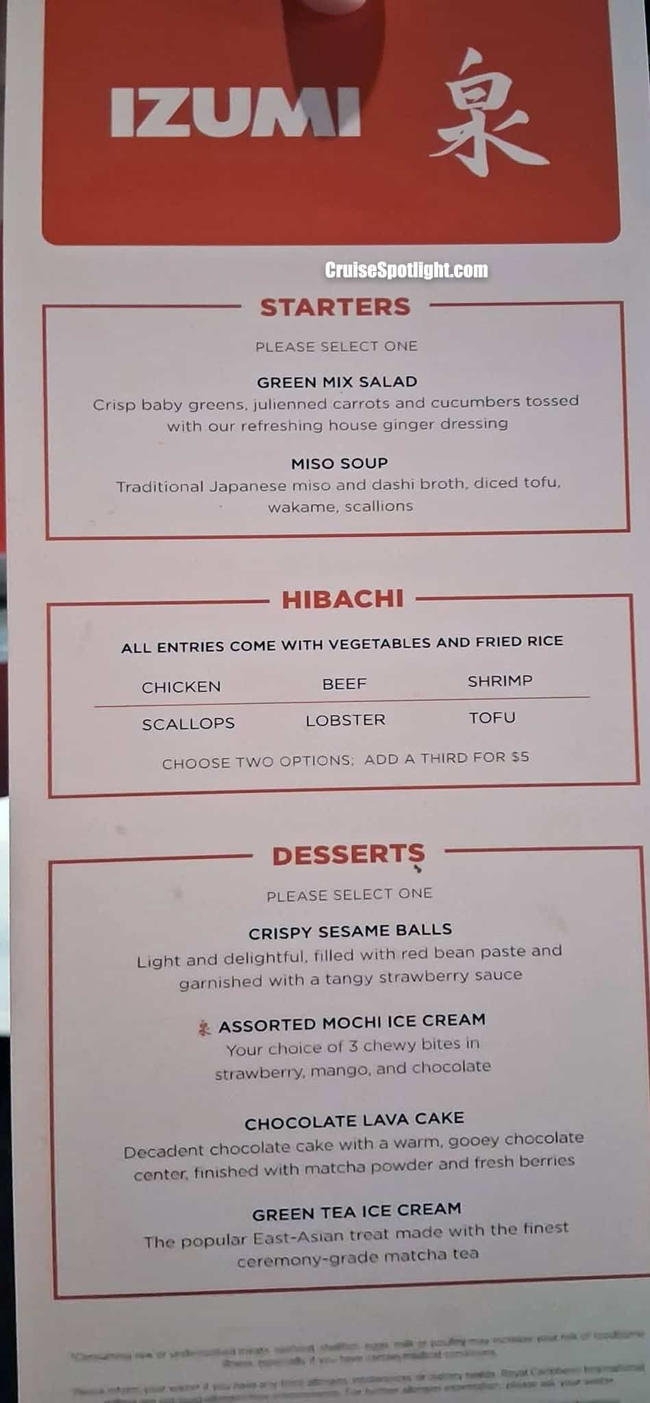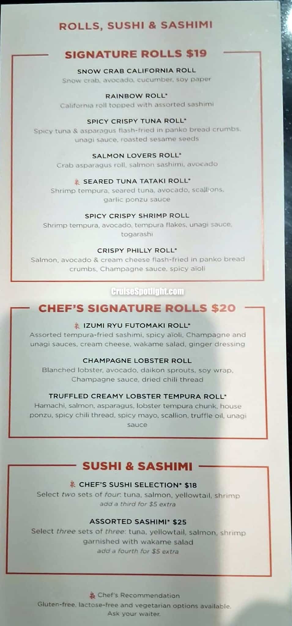 For sushi/non-Hibachi diners, you can choose to pay a la carte or a prix fixe menu for $45 (although you might find sales on your cruise planner before the sailing).