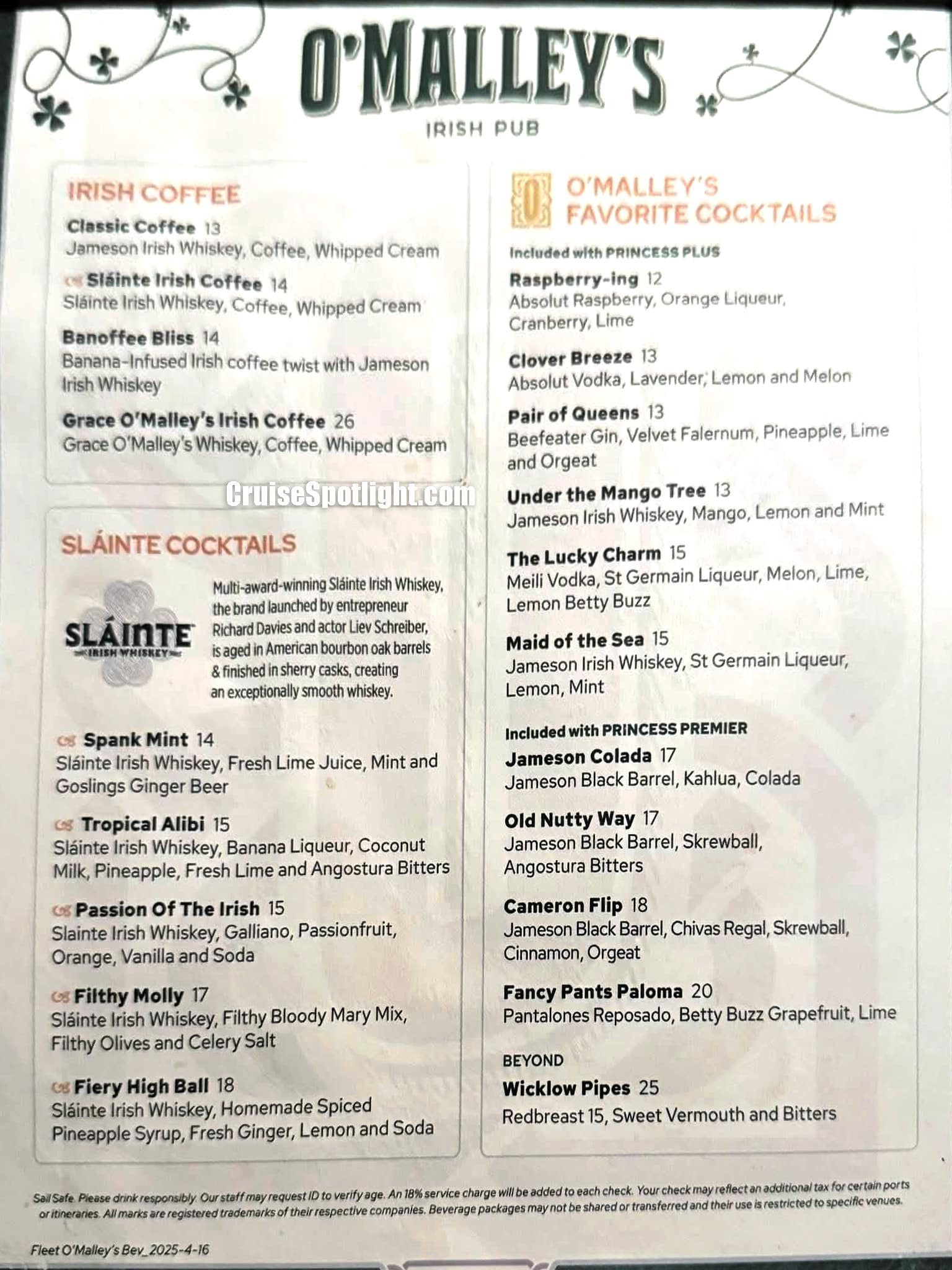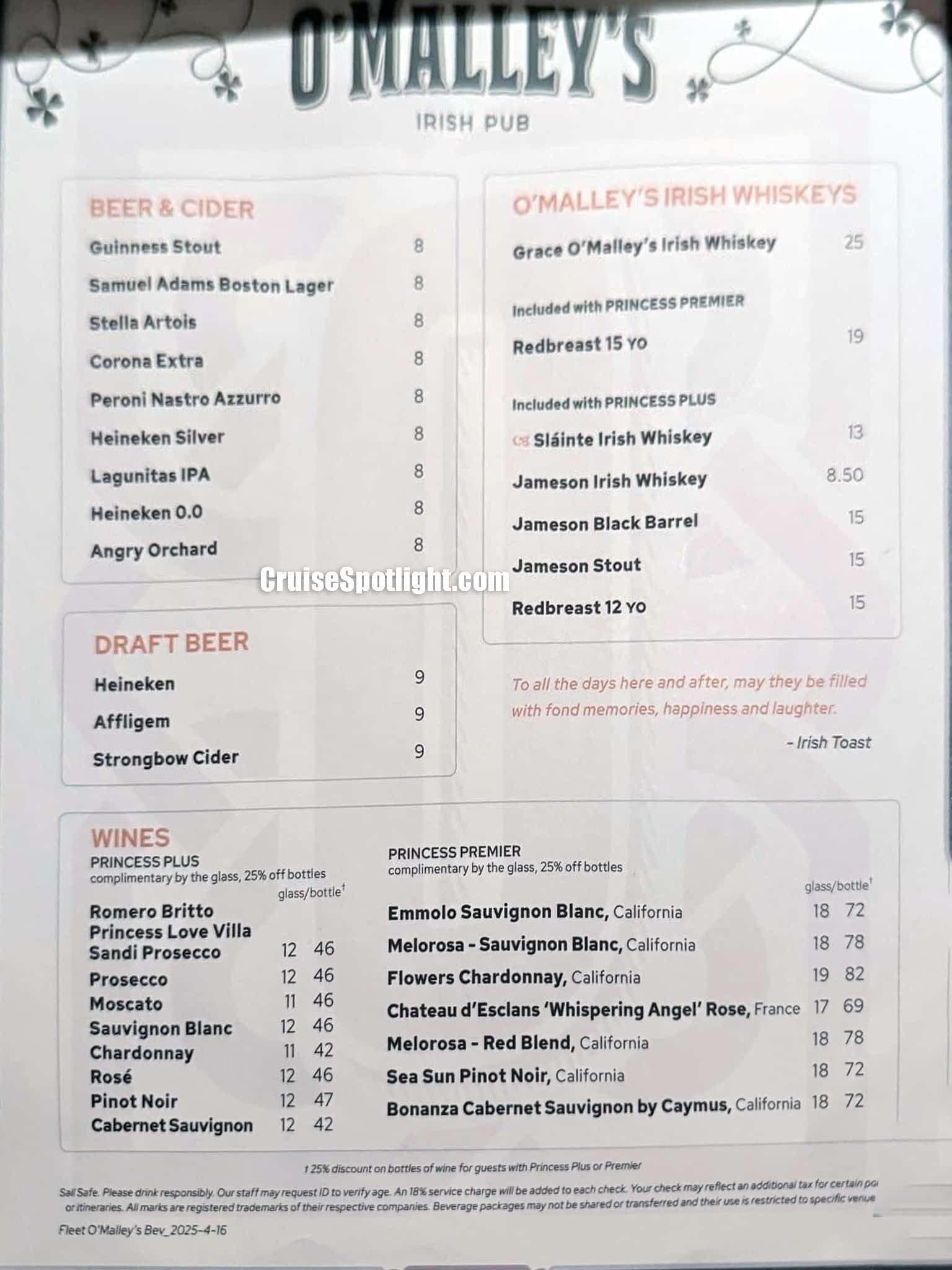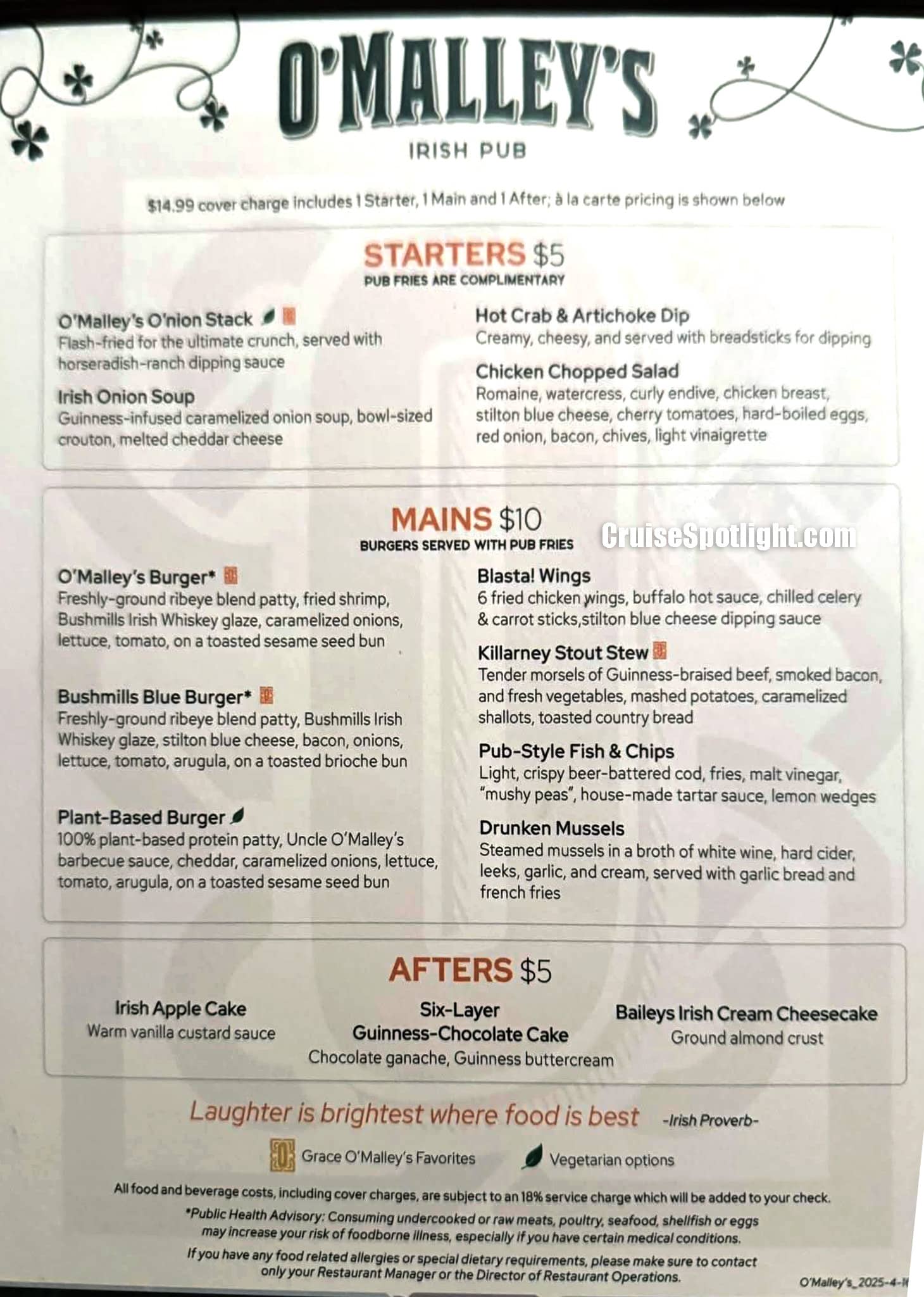 A $14.99 cover charge includes 1 starter, 1 main, and 1 after. This restaurant is included in the Princess Plus and Princess Premier packages.