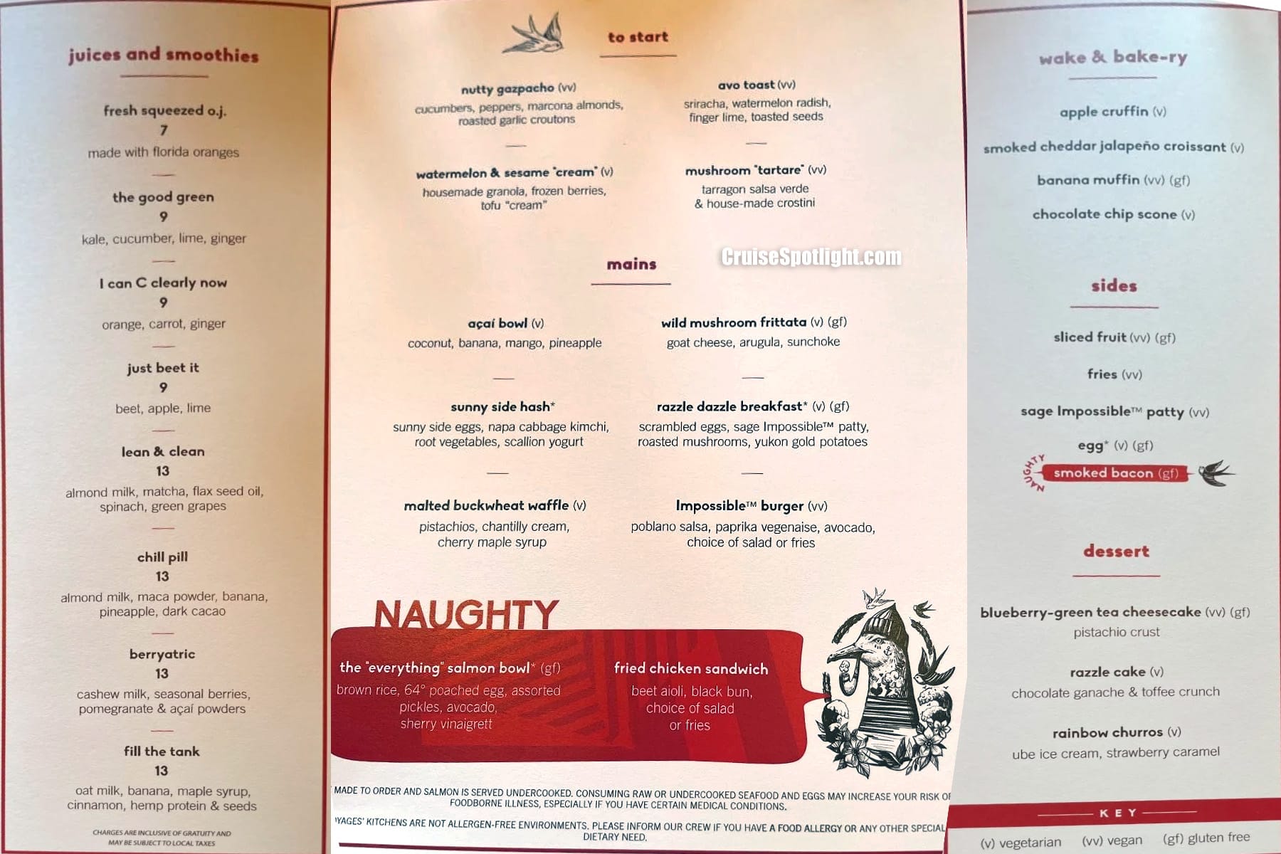 Razzle Dazzle is open for Brunch (usually 8 AM to 1 PM sea days, and earlier on port days) and dinner (5:45 PM until 10 PM).