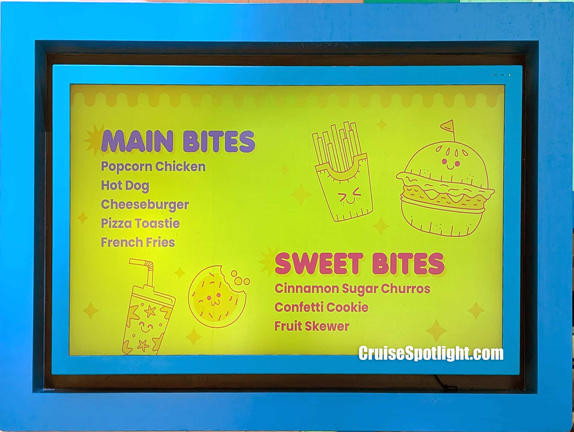Surfside Bites is included in the cruise fare so there is no additional cost to eat at this venue. Remember, beverages are not usually included and will be extra.