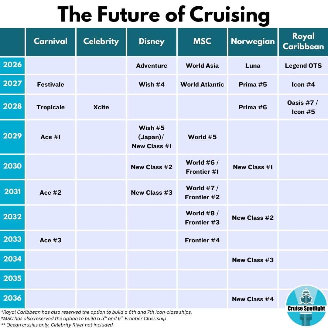 While 2026 is a quieter year for new ship launches, 2027 is already shaping up to be much busier. At least 6 new ships are currently on the horizon, including Carnival Festivale, the 4th Disney Wish Class ship, MSC World Atlantic, Norwegian Cruise Lineโs 5th Prima Plus ship, which is expected to be about 10% larger than Aqua and Luna, the 4th Icon Class ship from Royal Caribbean, and Margaritaville at Seaโs third ship, the Beachcomber.