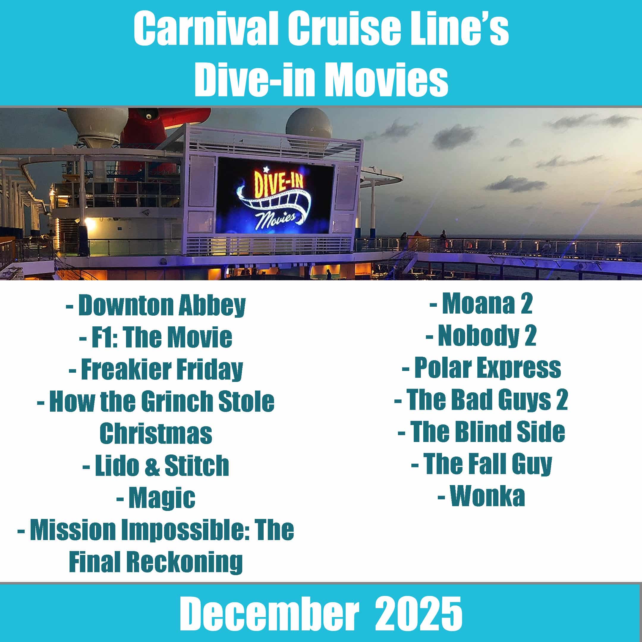 The following movies will be showing on Carnival cruise ships for December 2025.