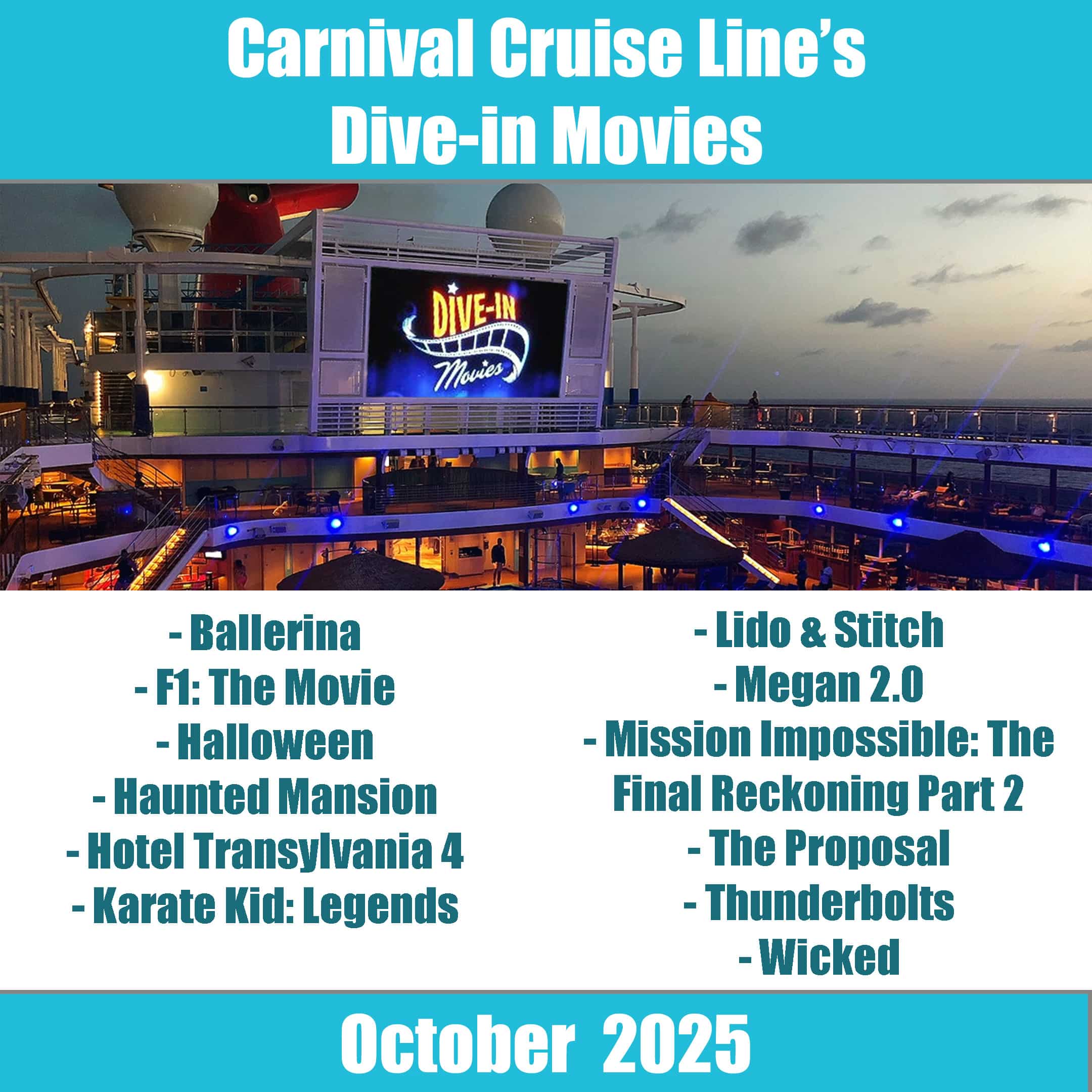 The following movies will be showing on Carnival cruise ships for October 2025.