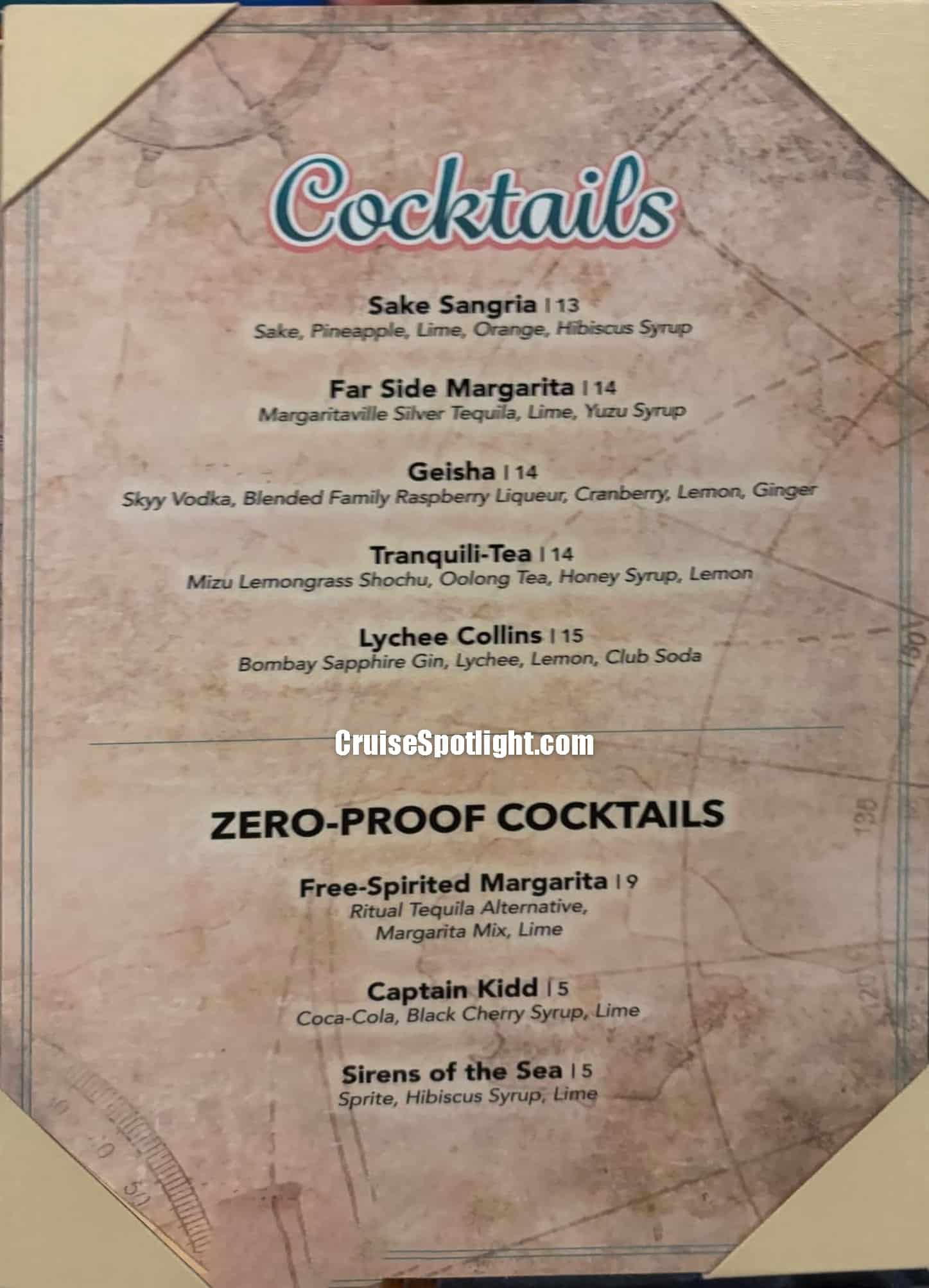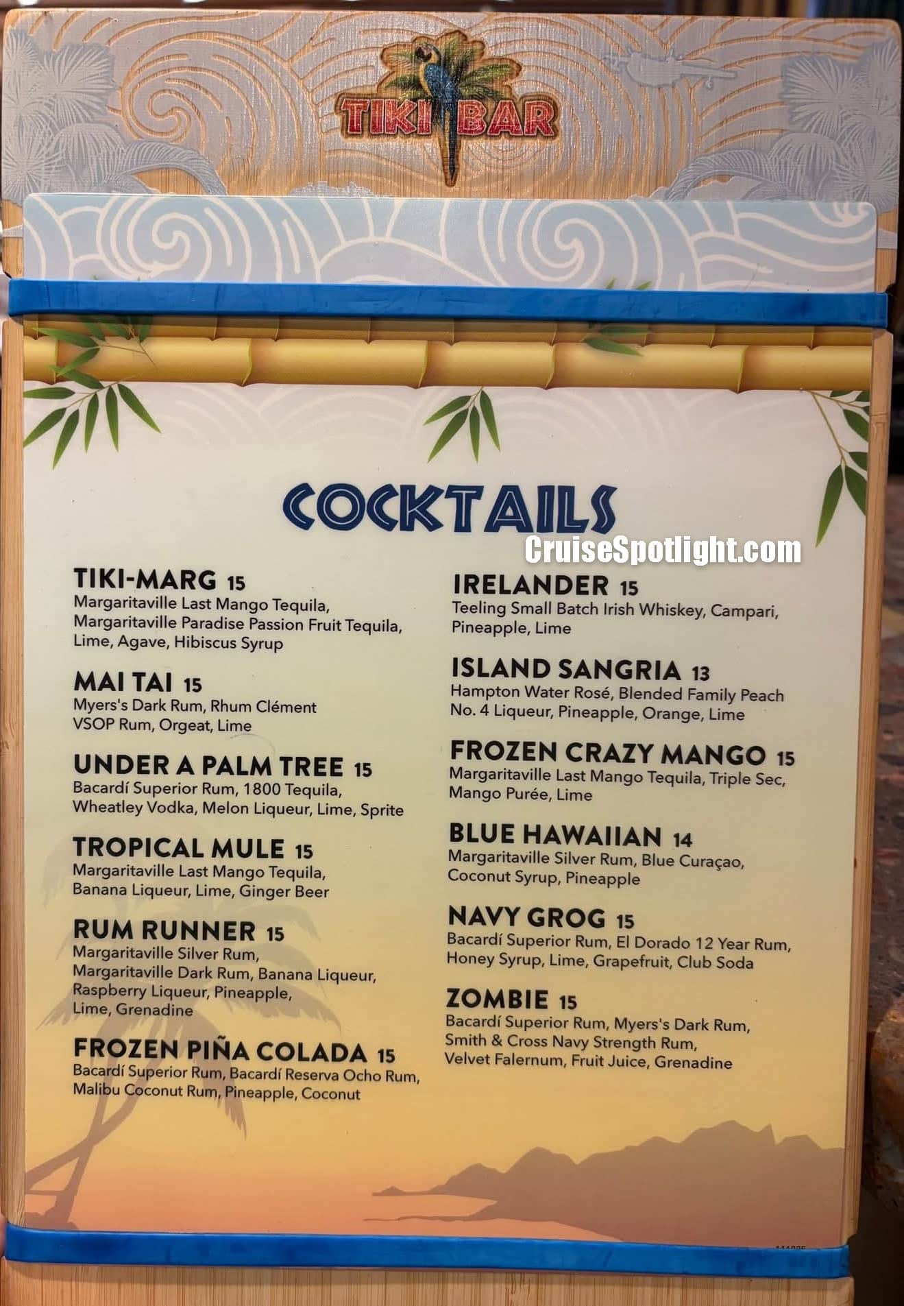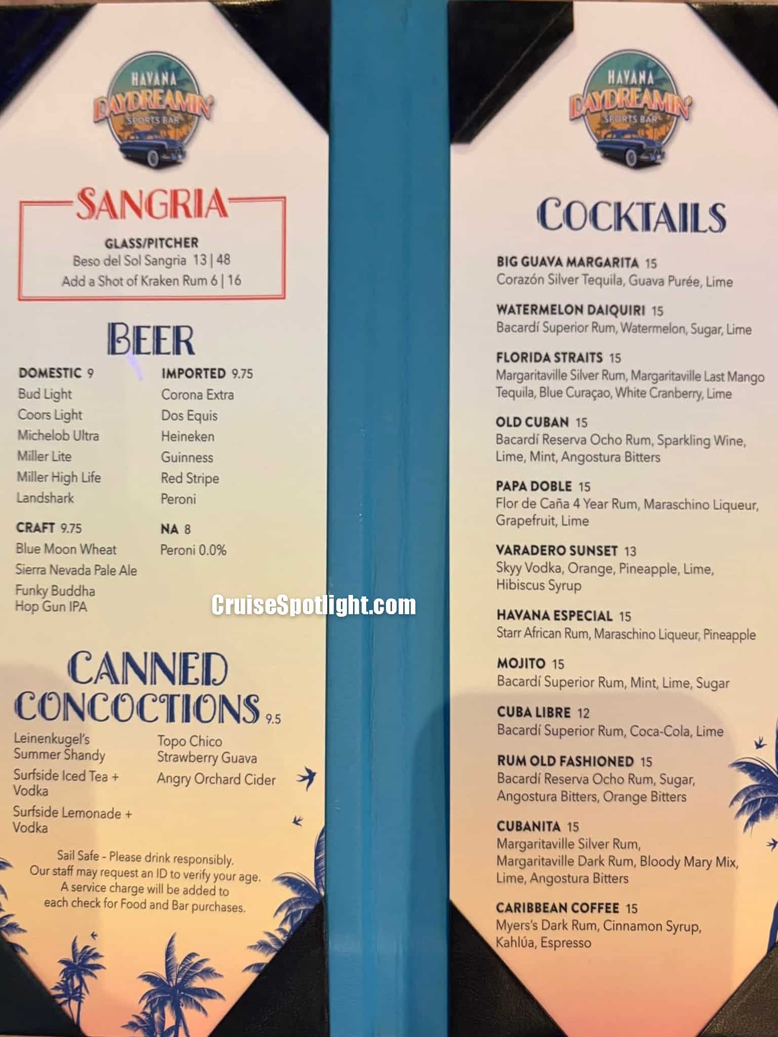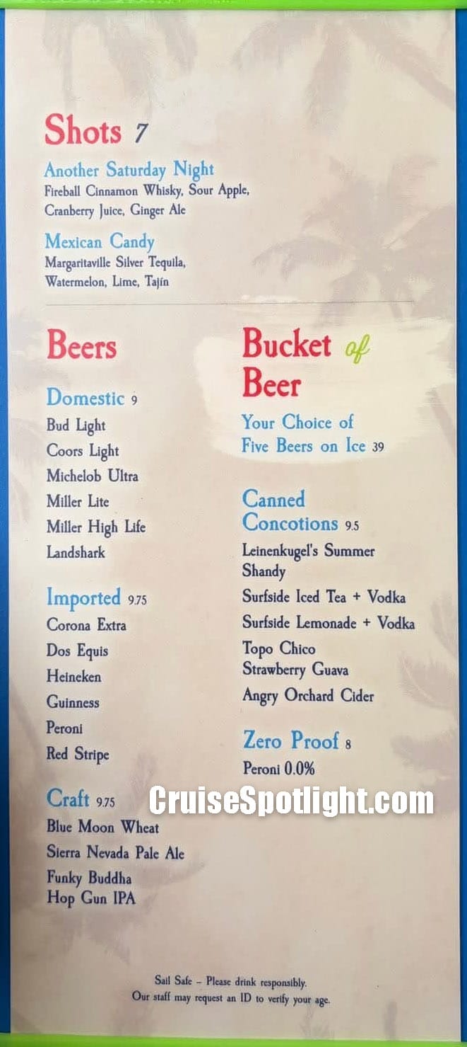 Below, you’ll see the menus for 2026. If you sailed on some of the first Margaritaville at Sea sailings, you’ll notice prices have increased by about $1 per drink since the original launch.argaritaville at Sea sailings, you’ll see the prices have increased about $1 per drink since original launch.