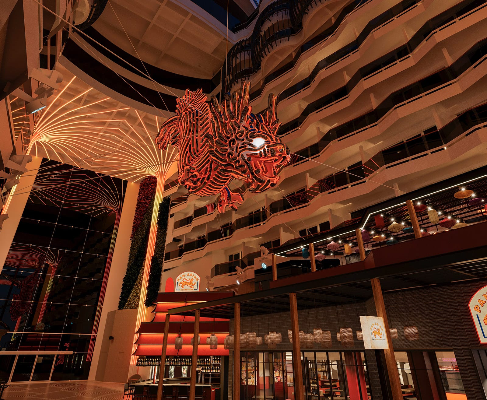 One of the most striking design features will be a 40-foot-long stainless steel dragon suspended 30 feet above the open-air World Promenade. The dragon will be covered in 700 mirrors and 3,000 LED lights that illuminate each evening, creating a dramatic visual centerpiece for the outdoor promenade area.