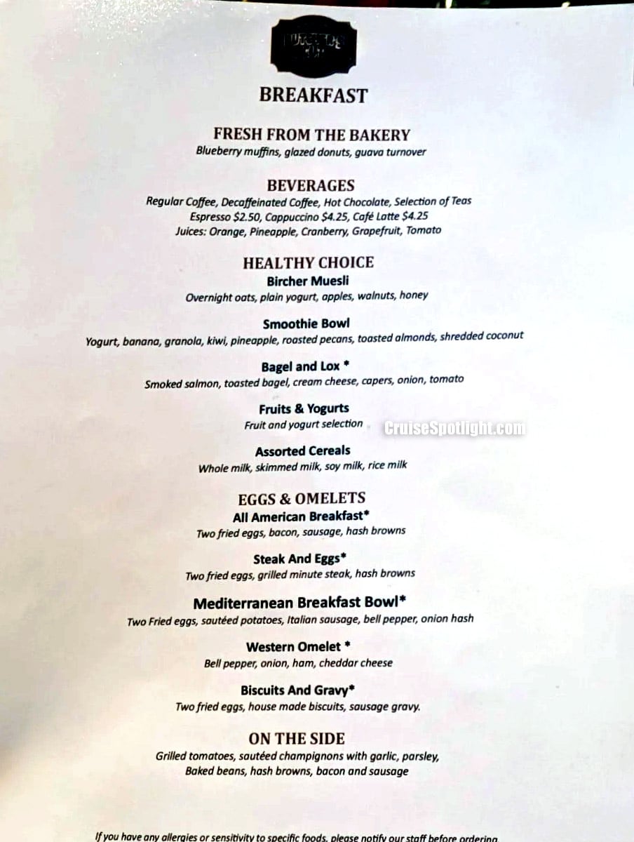 Now, on select ships, you can dine here for breakfast as well and for no extra cost. For breakfast, you can order a Bagel and Lox, assorted cereals, a western omelet, and biscuits and gravy, among other things. You can also order sides like hash browns, baked beans, and bacon.