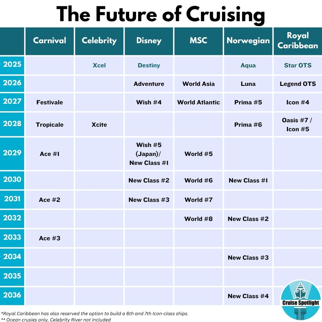 This build schedule is one of the most aggressive in the cruise industry. No cruise line has built out so many mega ships so quickly. Royal Caribbean’s Oasis Class debuted in 2008 and will have its seventh ship debut in 2028, meaning twenty years for seven ships.