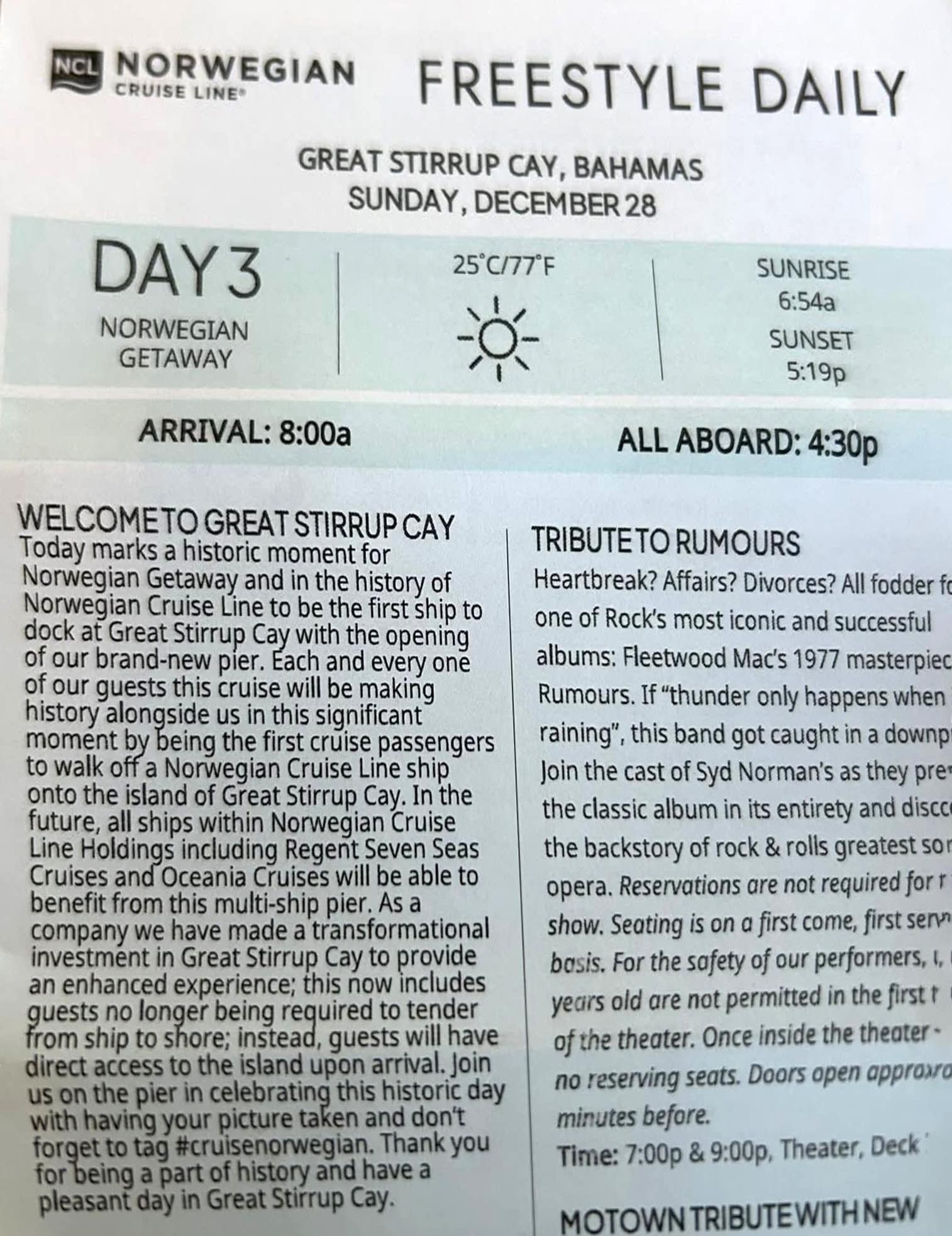 Norwegian highlighted the moment as a company first, noting that guests on this sailing were the first cruise passengers in the line’s history to walk directly from a Norwegian ship onto Great Stirrup Cay.