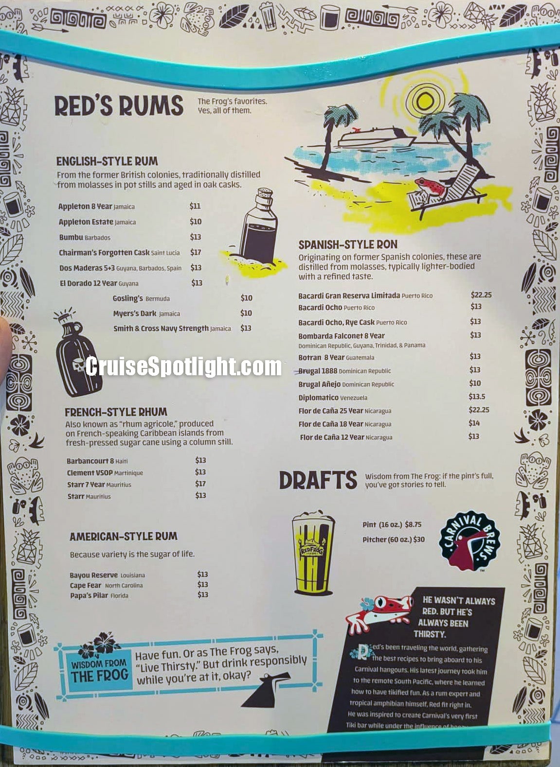 The Red Frog Tiki Bar is a supersized version of the Red Frog Rum Bar that's on most other Carnival ships. This super-sized, two-story Caribbean themed bar is at the heart of the Lido Pool area and is always full of energy.
