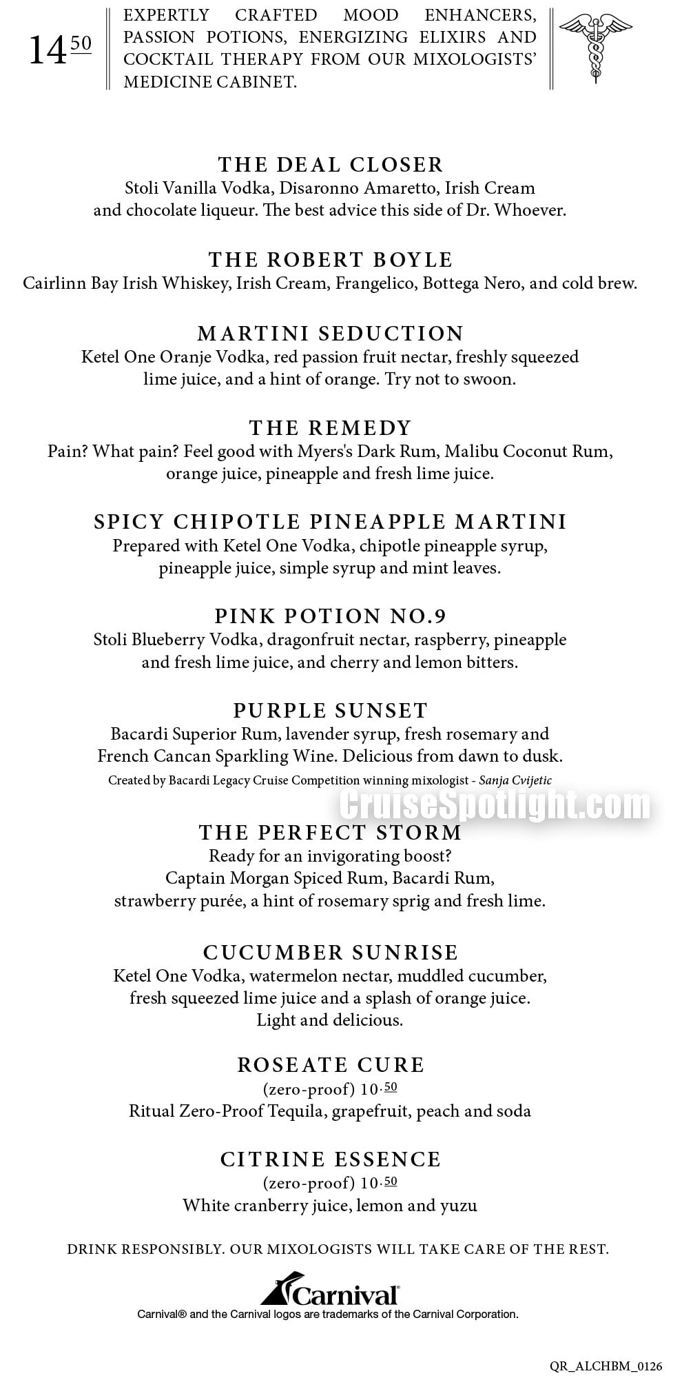 Alchemy Bar is Carnival's signature high-end cocktail bar. It's an excellent place for pre- or post-dinner drinks. Here, experienced bartenders whip up some delicious, hand-crafted cocktails. If you want to try a bunch, stop by when you see "Martini Tasting" on the FunTimes, and you try four smaller portions.