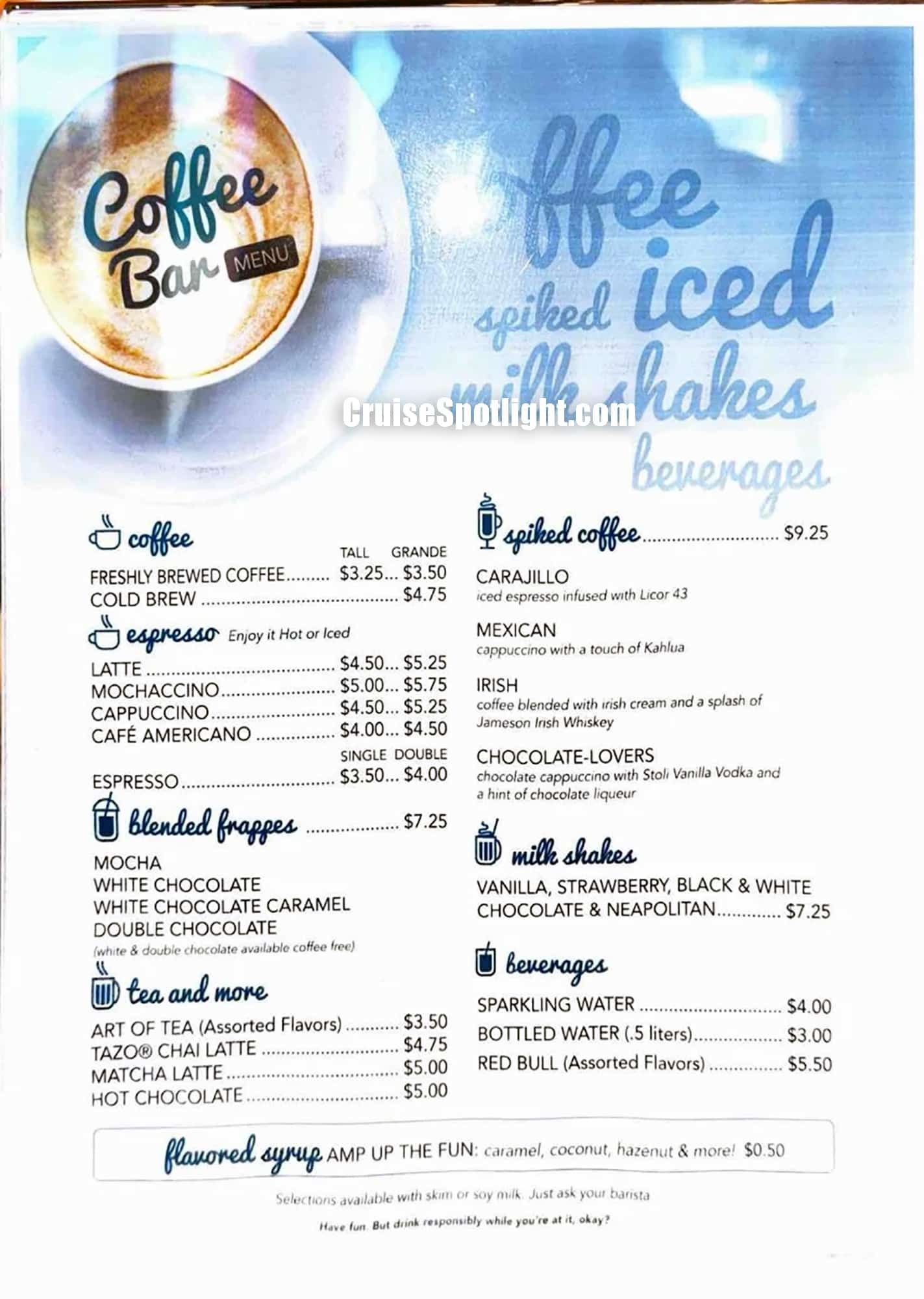 The Piazza Cafe is the go-to spot for speciality coffees and milkshakes. It has a different menu from Java Blue Cafe which is found on the newer ships.