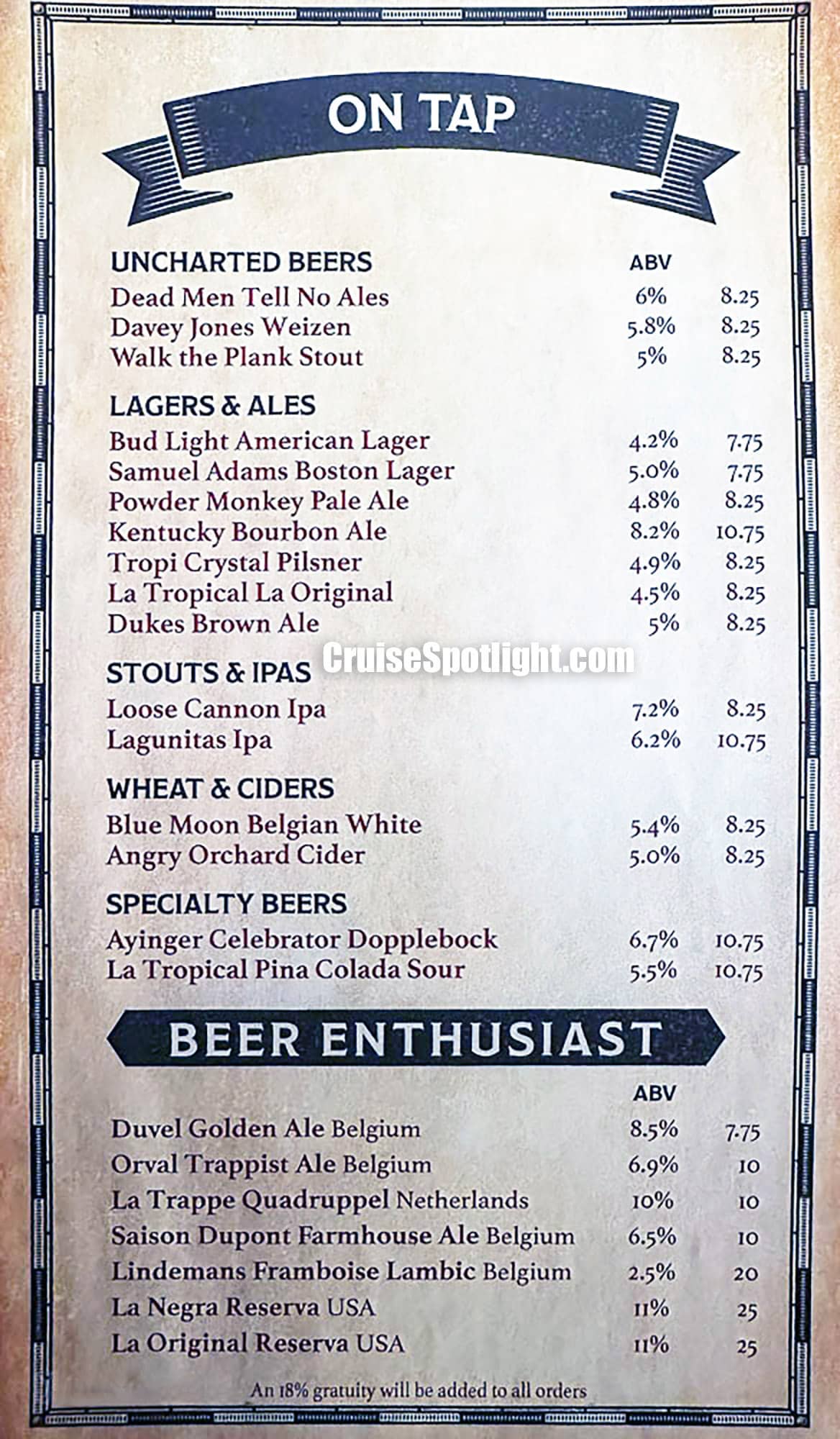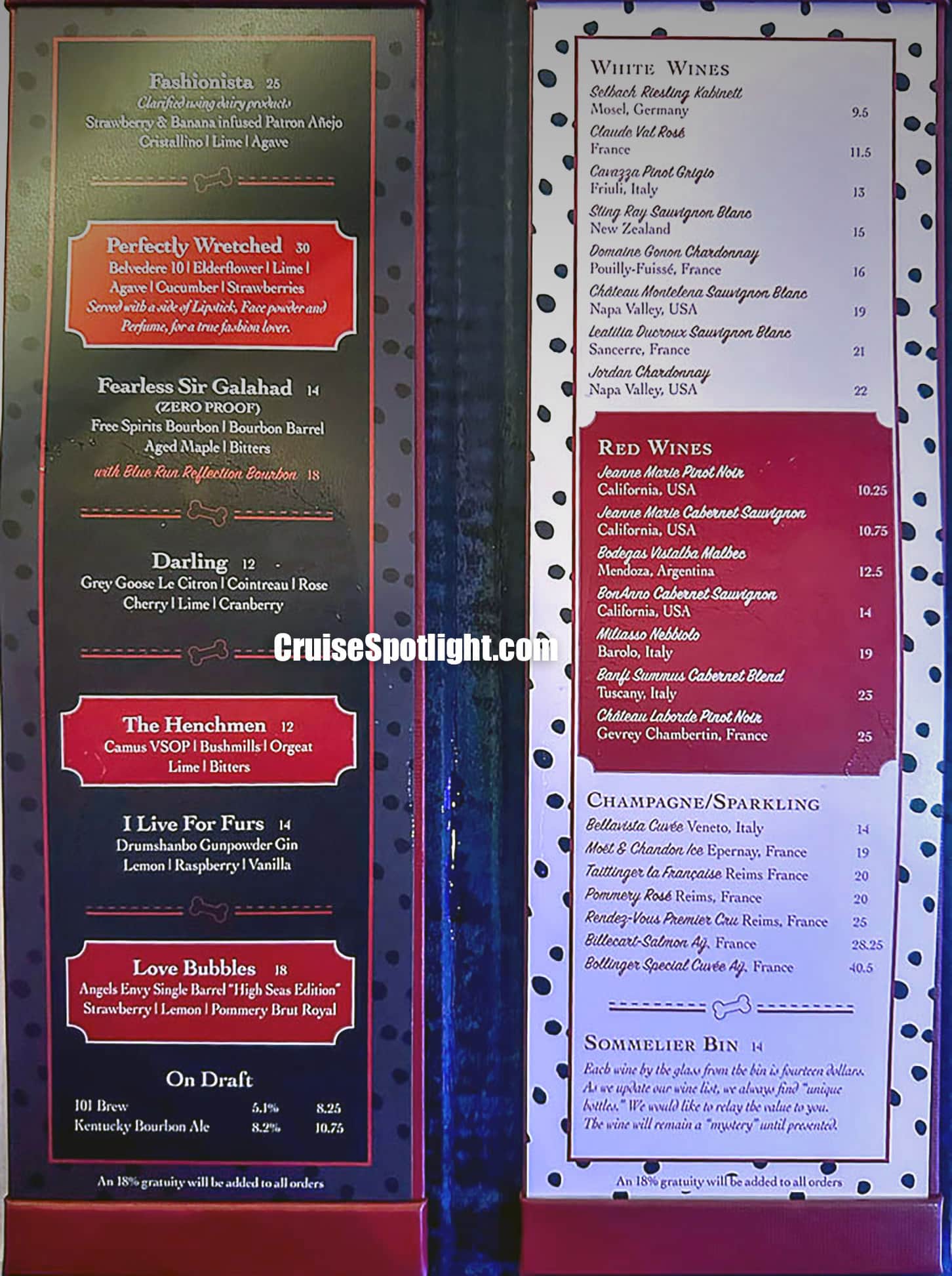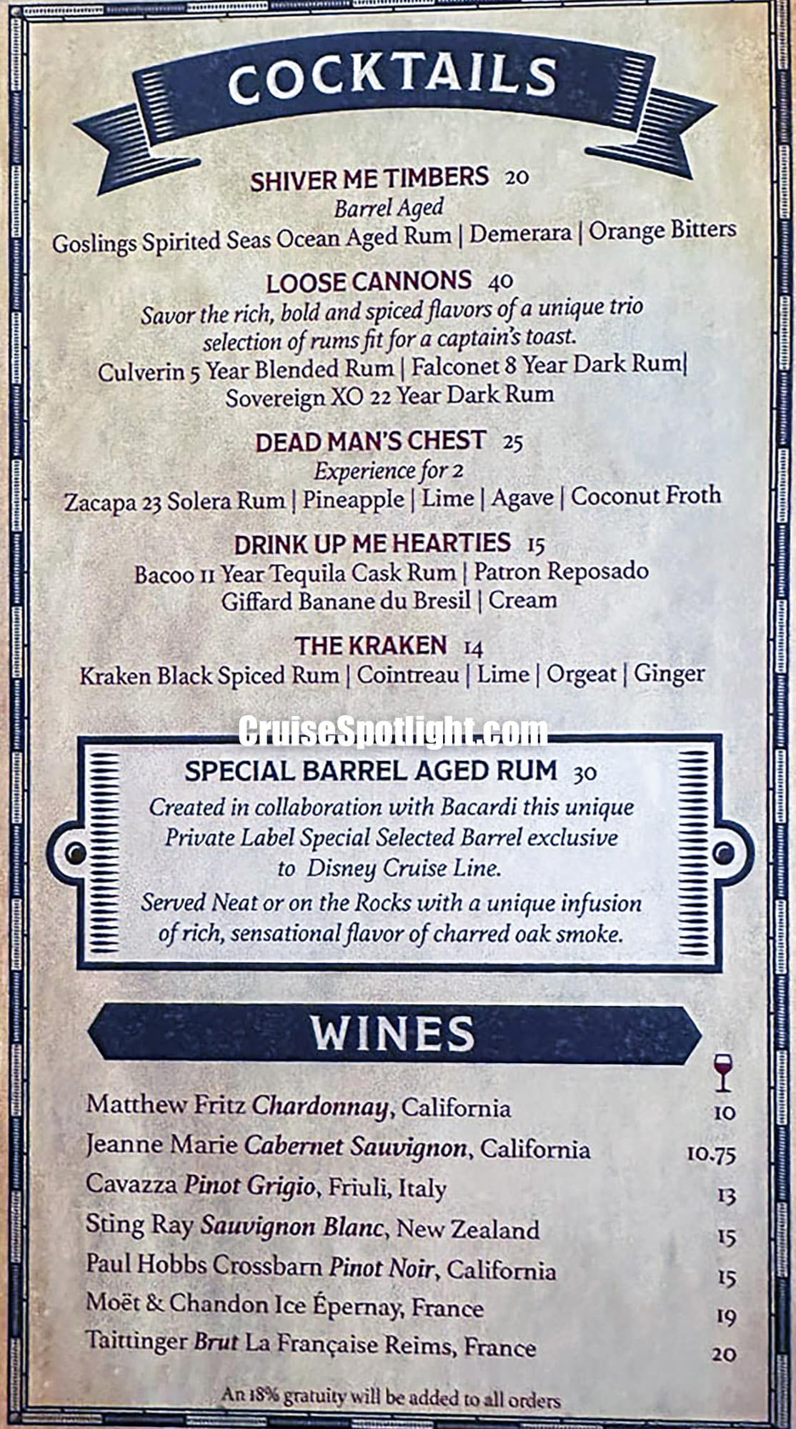 Disney Destiny has 12 different bars and lounges where you can enjoy a beer or cocktail. It also has 1 other bars that are available to select guests. Below you can see all the different bars that can be found on Destiny along with their current menus and prices.
