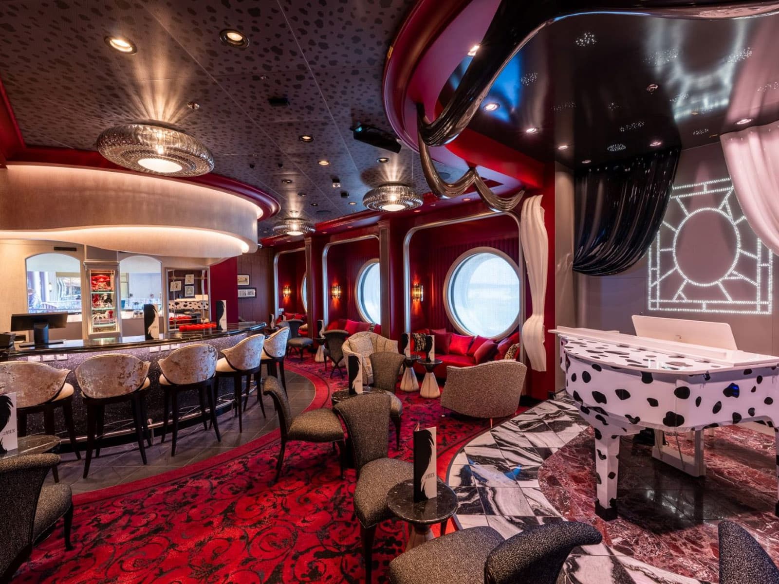 This lounge takes its inspiration from Cruella de Vil, blending bold black and white design with pops of red that reflect her over the top style. The cocktails lean into the theme with playful villain inspired touches that make the space feel straight out of the 101 Dalmatians world.