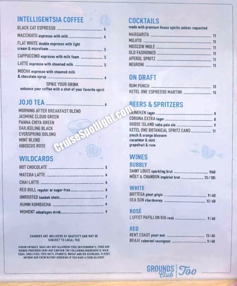 Grounds Club is your stop if you enjoy premium coffees (one of the few things not included on Virgin Voyages). They serve Intelligentsia Coffee, cappuccinos and lattes as well as JoJo Tea. You can also find a Ketel One Espresso Martini here for a pick-me up. Don't forget to grab a few of the delicious complimentary pastries here.