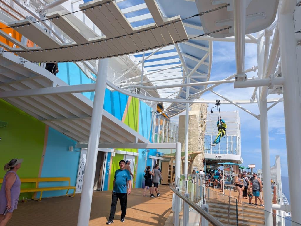 I’m torn. Carnival, MSC, and Norwegian offer full ropes courses for free on some of their ships (see which ships have ropes courses here). They don’t make you suit up or watch a safety video either. You just get in line, get quick instructions, and go. Their courses are also more challenging.
