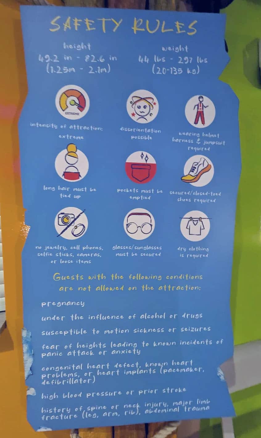 Crown’s Edge has a few requirements you must meet to ride. While there is no age limit, there are strict height and weight restrictions. Guests must be between 49.2 inches and 82.6 inches tall and weigh between 44 and 297 pounds.
